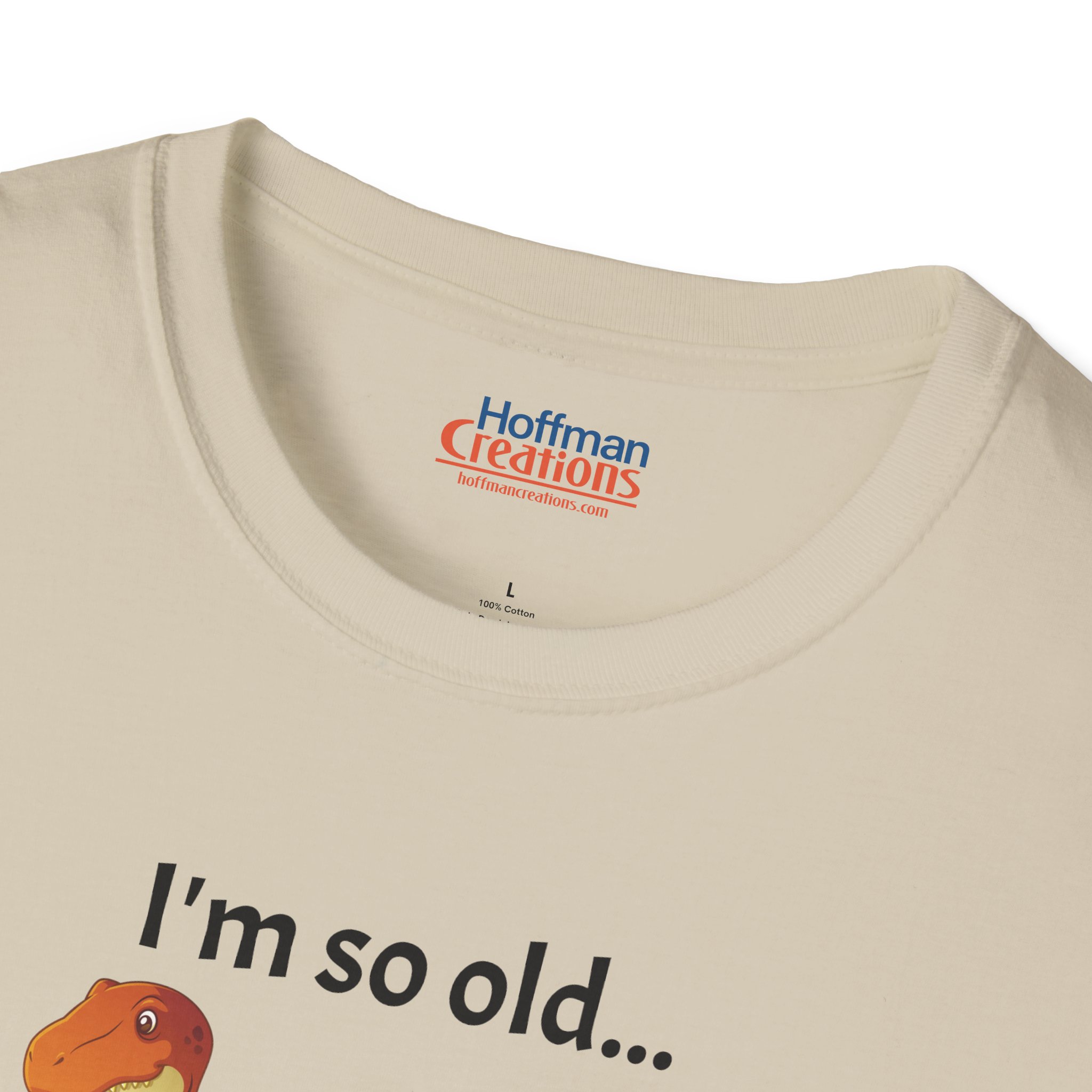Check out this great sarcastic, humorous gag graphic T-shirt featuring the text “I’m so old… my pet “Rex” was a T-” accompanying a cartoon T-rex dinosaur.